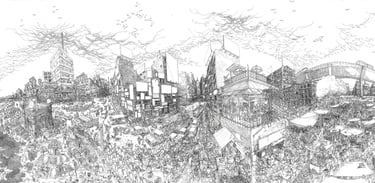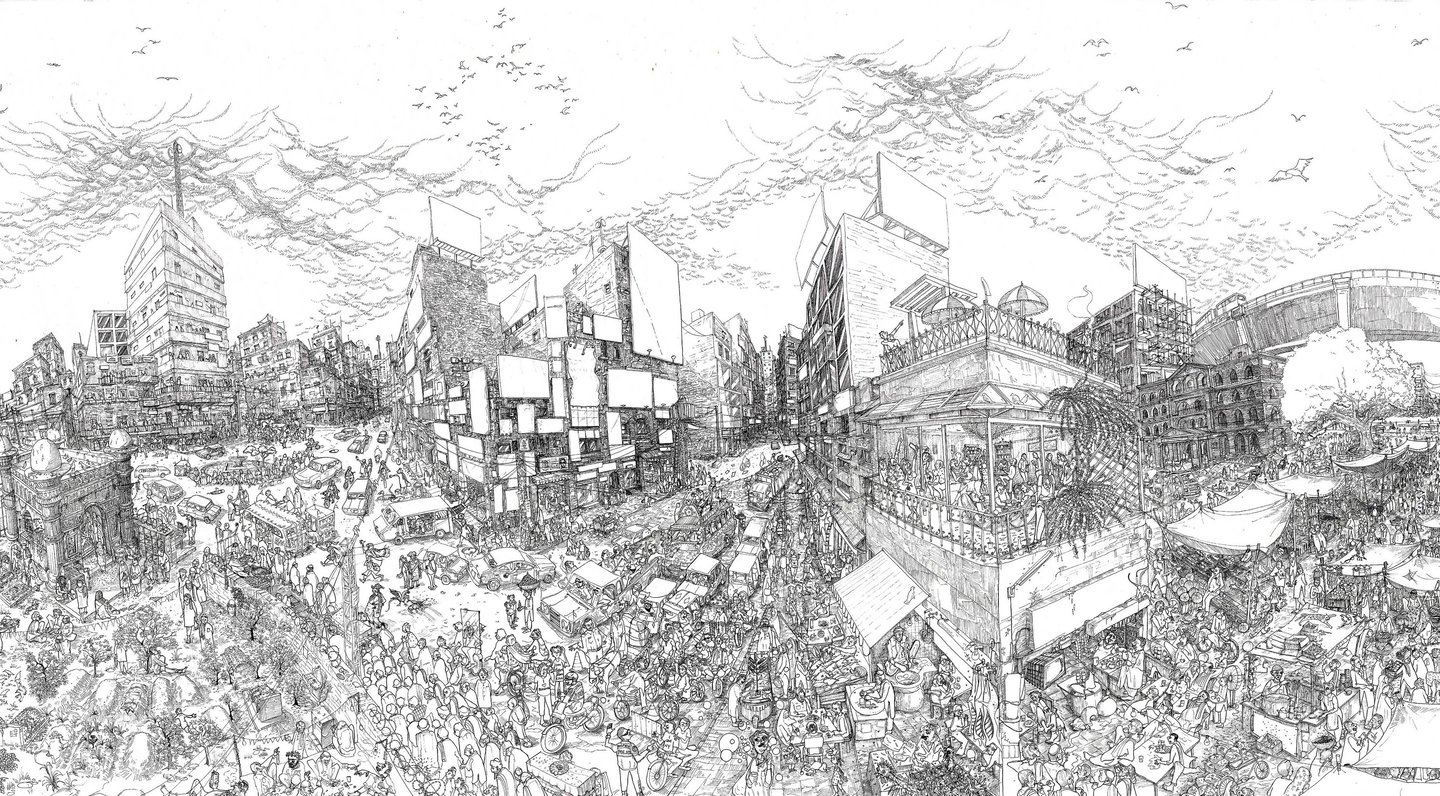 Detail from City of Dreams and Nightmares, Lahore(2017) - Pen and Ink on Paper, 8' x 4'