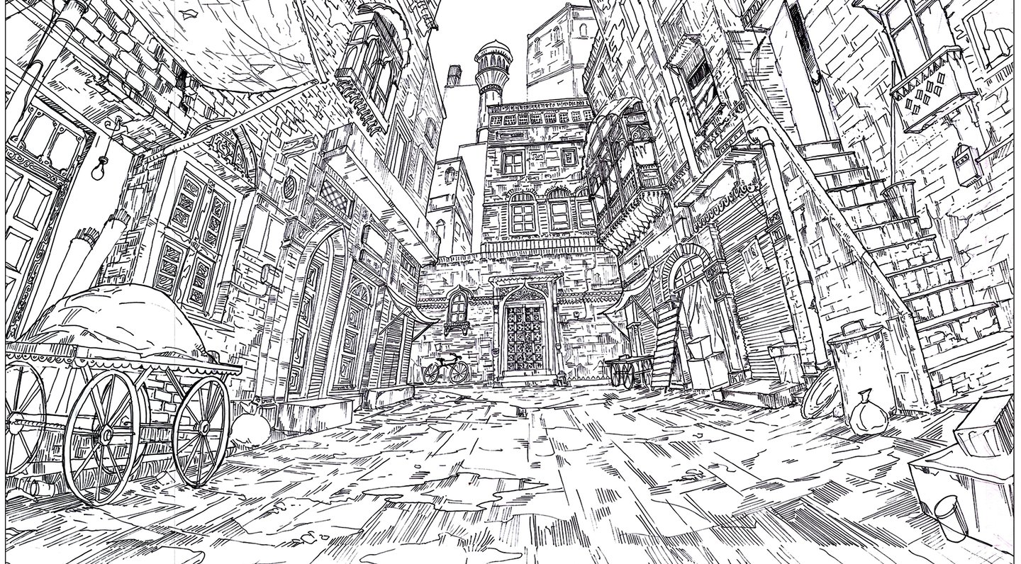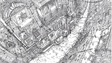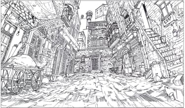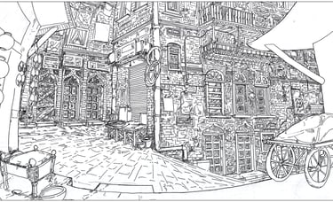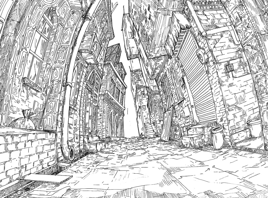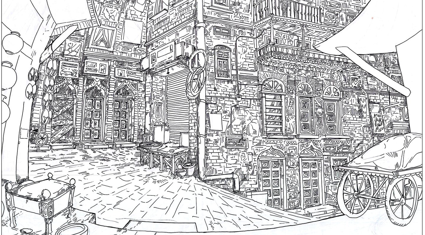 A series of drawings made for environment design of a short animation film. The story is about a Latoo (top) which spins around the city telling eccentric stories about the people of the Walled City